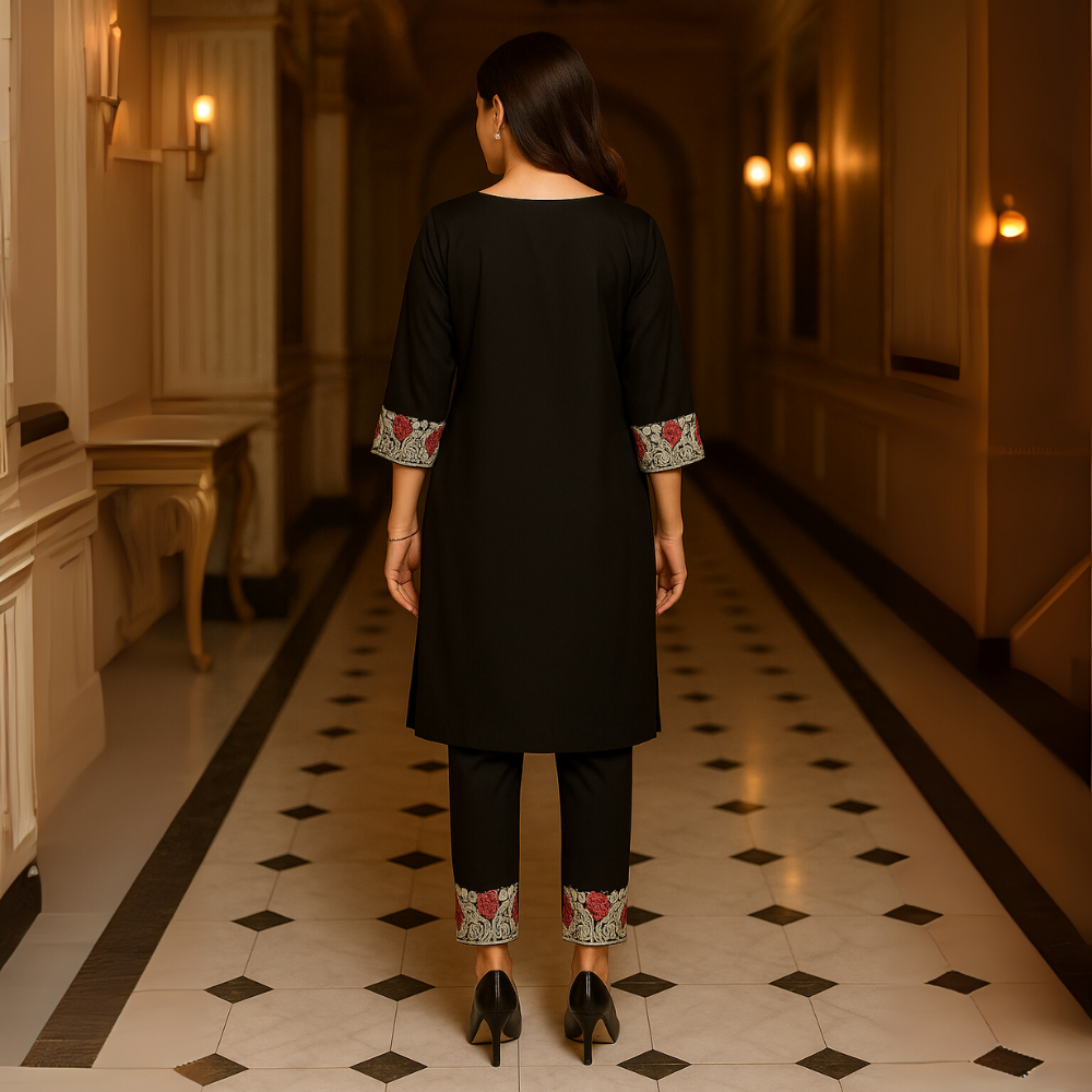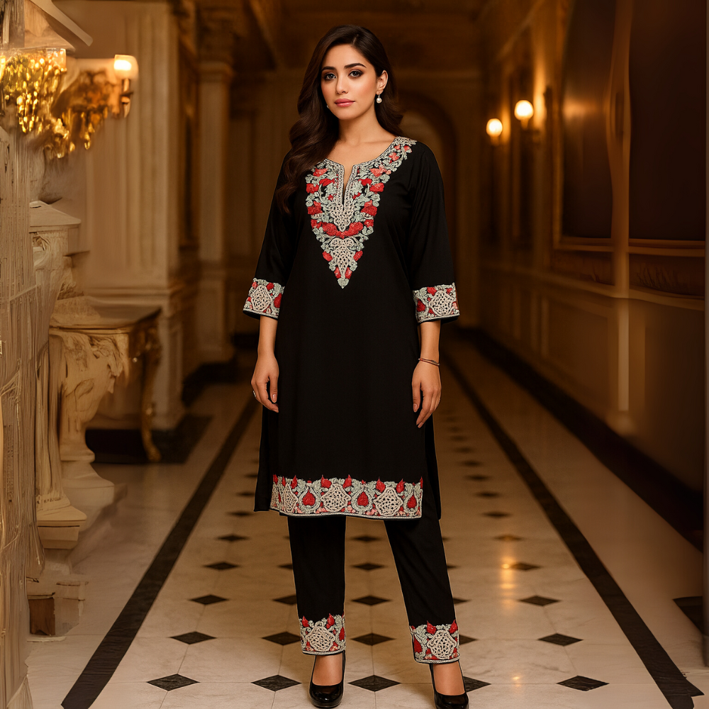 The highlight of this set lies in its detailed thread embroidery in rich hues of red, teal, and ivory adorning the neckline, cuffs, and pant hem — while the shirt bottom remains clean and minimal for a refined finish.