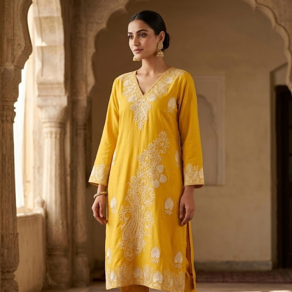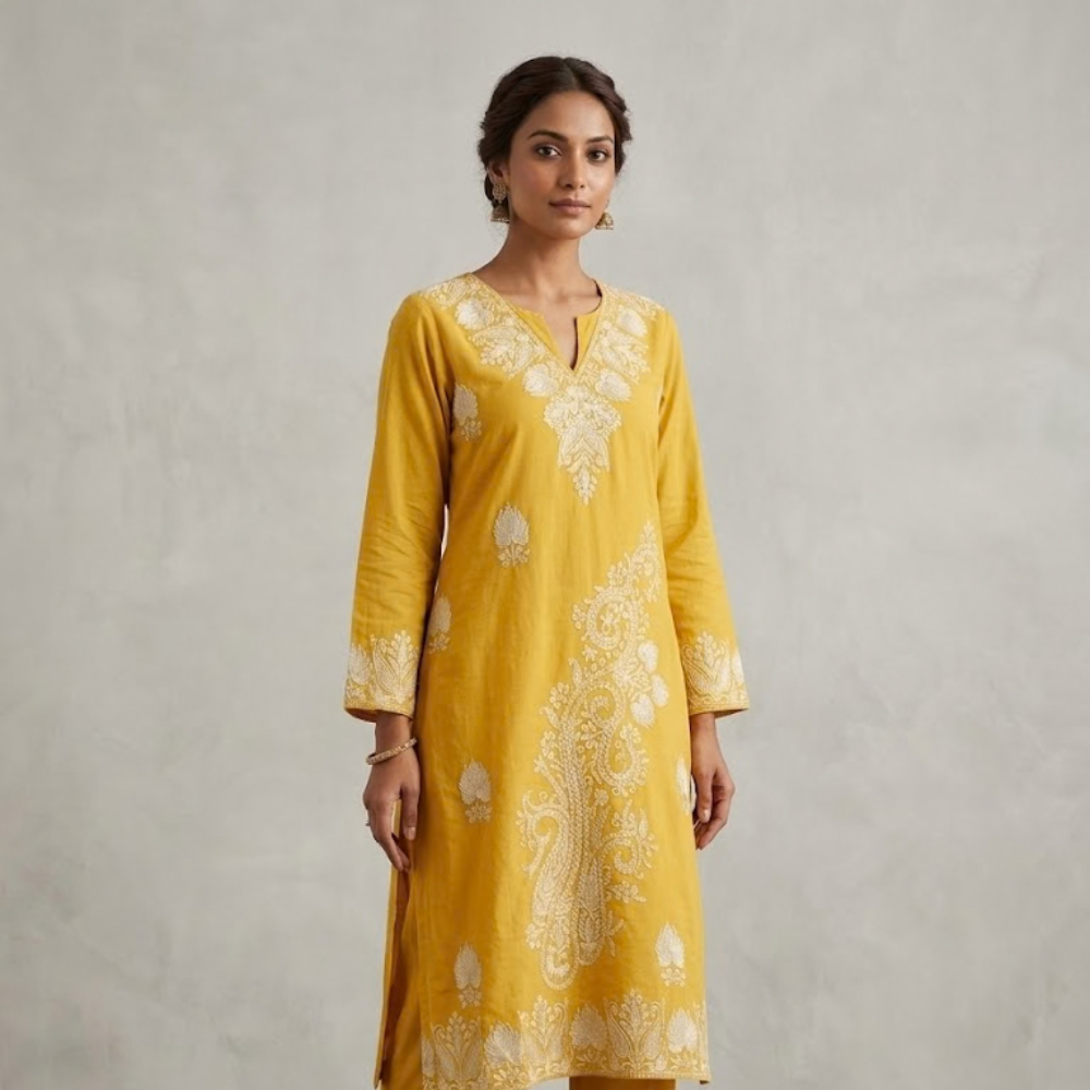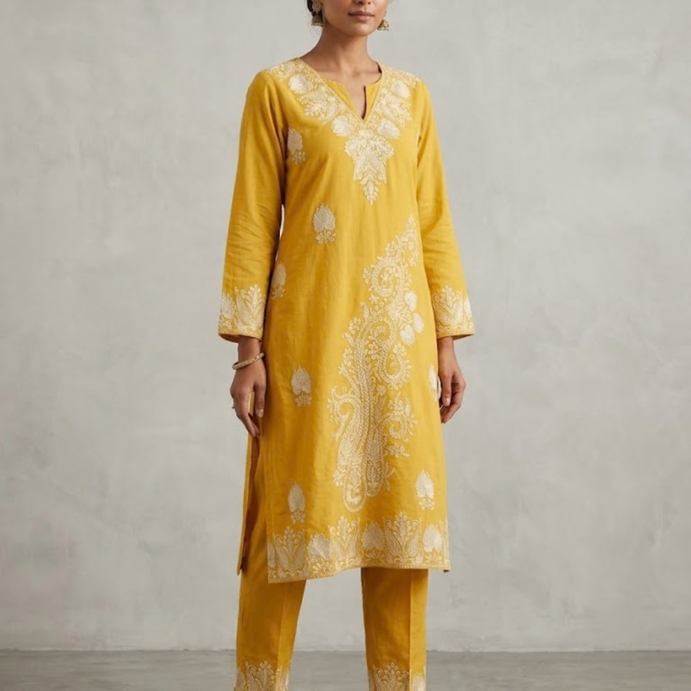 Our Mustard & Ivory Paisley Statement Set is designed for the woman who loves to stand out with sophisticated color play. The vibrant mustard base provides a cheerful, warm canvas for the intricate ivory embroidery. The unique asymmetrical layout—featuring a grand paisley branch sweeping across the front—creates a modern, high-fashion look that breaks away from traditional symmetry.