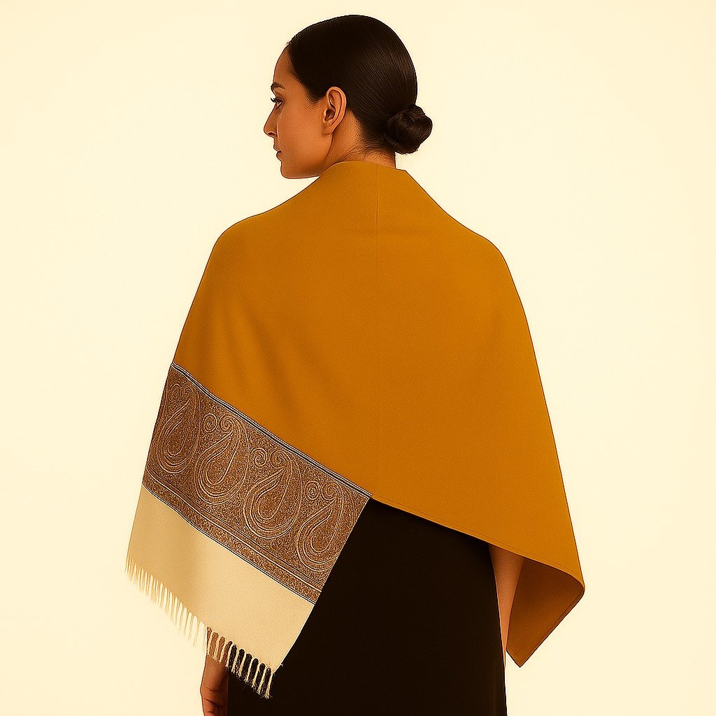 Made from a soft wool-blend fabric, it offers comfort and elegance throughout the day. The mustard base provides a pop of color, while the detailed border in earthy hues brings in that classic Kashmiri finesse.
